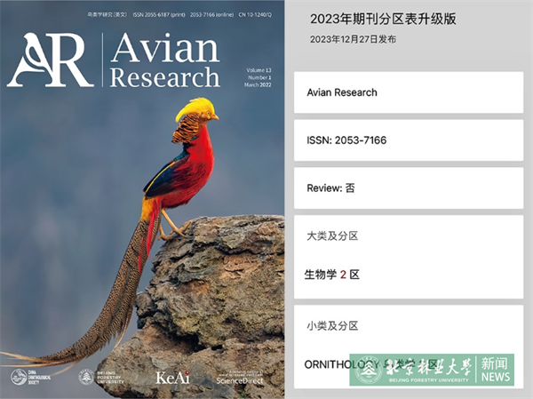 日前,《2023年中国科学院文献情报中心期刊分区表》正式发布。我校主办的两本英文期刊表现亮眼,《森林生态系统(英文)》(Forest Ecosystems)蝉联入选农林科学大类1区,林学小类1区;《鸟类学研究(英文)》(Avian Research)入选生物学大类2区,鸟类学小类2区。