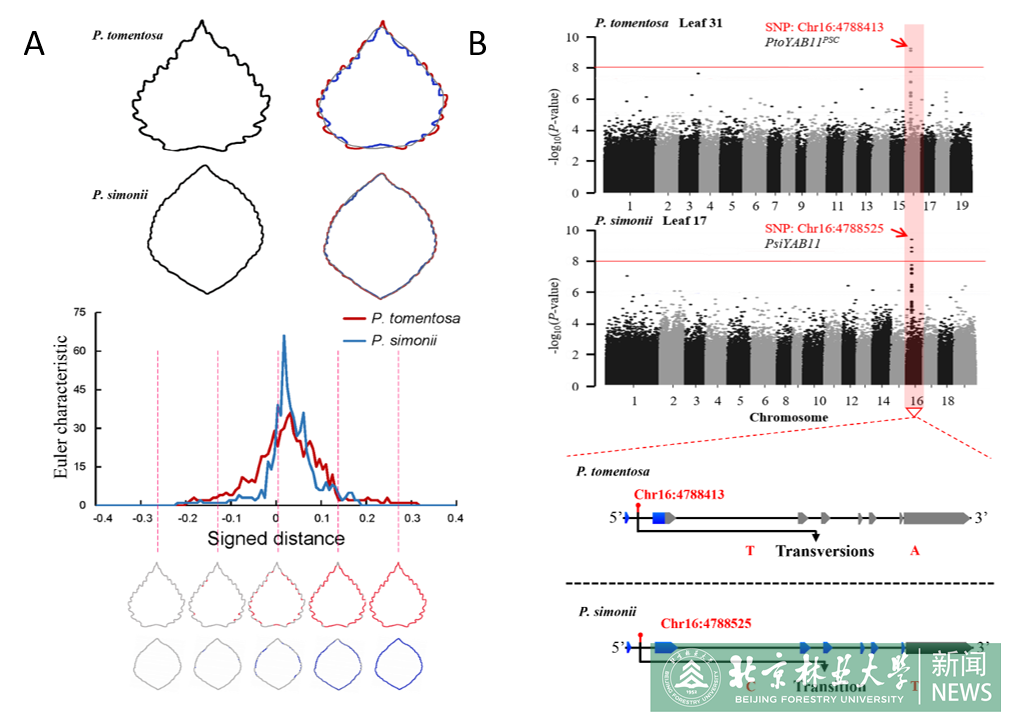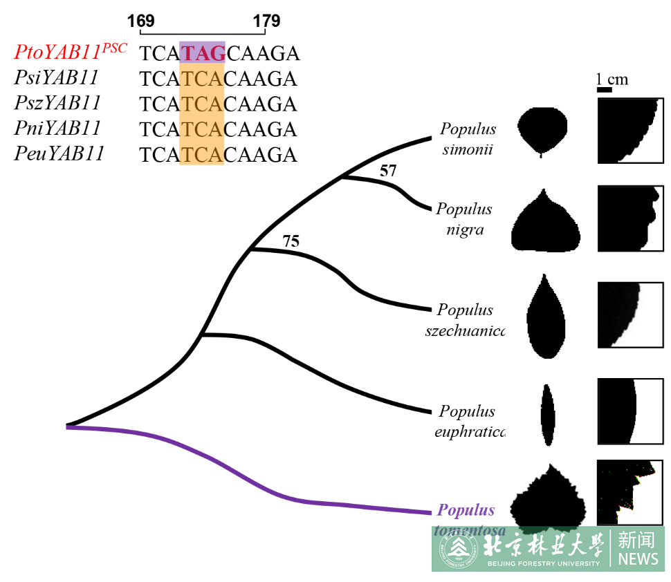 杨树叶片形态变异丰富,在种间与种内都存在显著的自然变异。为解析杨树叶片形态自然变异的遗传学基础,研究者利用两种叶形显著差异的杨树——毛白杨与小叶杨种质资源群体为研究材料。利用持续同调拓扑数据分析方法将杨树叶片形态量化为112个表型值。其中,54%的叶片表型性状广义遗传力大于0.4,属于中高遗传力性状。GWAS结果显示在毛白杨群体中有138个SNP位点与9个叶片表型显著关联,在小叶杨群体中,有171SNPs位点与8个叶片表型显著关联。在两个关联群体中,基因型-表型关联显著性最高的SNPs均位于YABBY11基因上。候选基因序列分析表明在毛白杨群体中,YABBY11携带提前终止位点(PtoYABBY11PSC),提前终止的氨基酸序列与DNA结合的锌指结构域完全丢失,仅保留了核定位信号。研究者选择YABBY11为候选基因构建杨属系统发育树,结果显示提前终止位点仅存在白杨派中,暗示了YABBY11PSC可能是一个白杨派特异的基因变体。