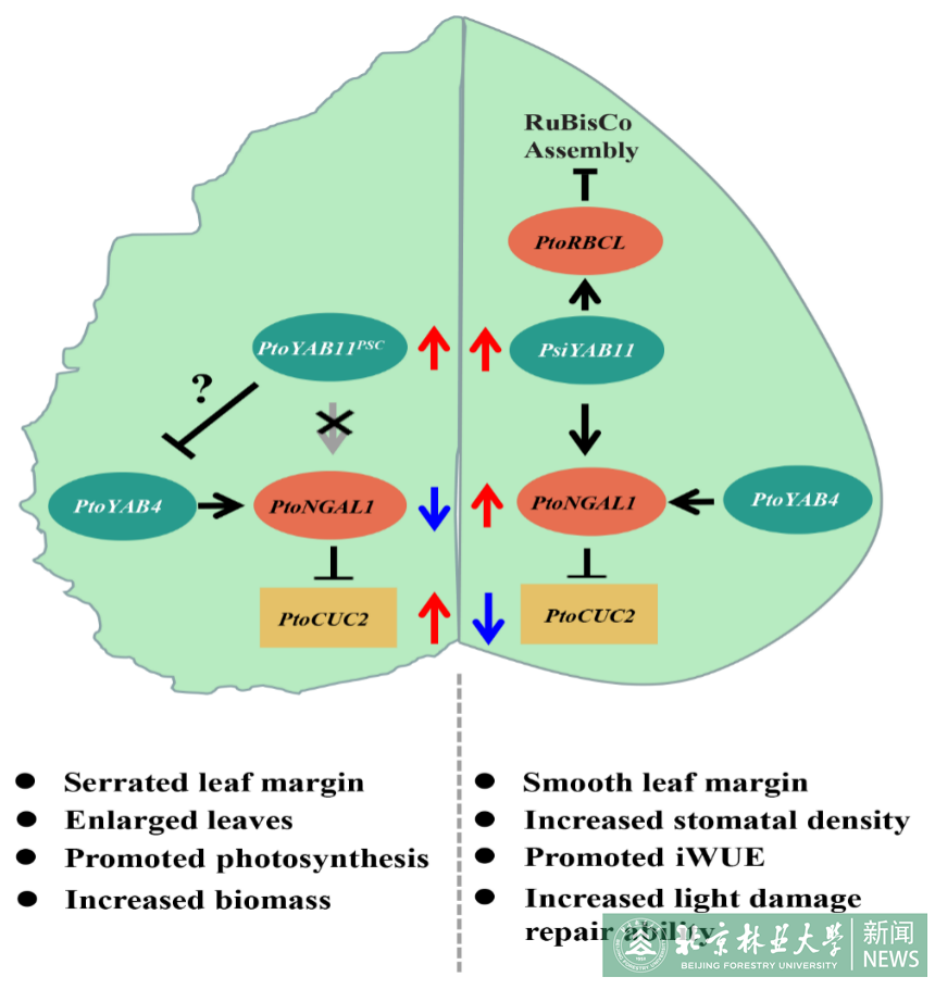 综合以上研究结果表明,在杨树基因组中,YABBY11通过反式调控作用激活NGAL1表达上调,进而抑制CUC2基因表达,调控光滑叶缘的形态发育。同时,YABBY11 激活RBCL基因表达,导致Rubisco大小链装配失调,进而光合作用效率显著下降。而在白杨派树种中,YABBY11PSC由于携带翻译提前终止位点,丧失了对NGAL1-CUC2模块以及RBCL基因的转录调控作用,进而导致叶片面积增大、叶片锯齿加剧、光合作用效率提升。此外,YABBY11基因在毛白杨与小叶杨基因组中均对环境胁迫响应信号响应敏感,暗示了YABBY11-NGAL1-CUC2模块可能是基因组与外界环境信号互作调控叶形变异的关键分子调控模块。该模块为系统了解叶形响应外界环境信号产生自然变异提供了一个全新的视角,为探索理想叶形遗传改良奠定了理论基础。