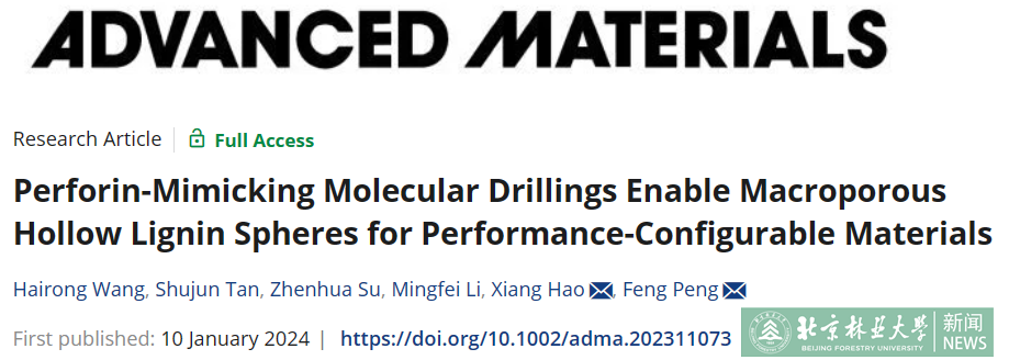近日,材料科学与技术学院彭锋教授课题组在材料领域顶尖期刊《Advanced Materials》(IF="29.4)发表了题目为“Perforin-Mimicking" Molecular Drillings Enable Macroporous Hollow Lignin Spheres for Performance-Configurable Materials”的研究论文。
