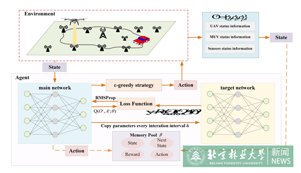针对上述问题,本文考虑在监控区域部署无人机和移动多功能车辅助下的无线可充电传感器网络架构(图1)。在该架构中,无人机作为移动充电器为传感器补充能量,而移动多功能车则作为移动基站为能量不足的无人机更换电池。研究团队关注的核心问题是如何最小化传感器死亡时间和无人机能量消耗(MDME),以确保网络的持续稳定运行。为了实现这一目标,研究团队提出了一种基于深度强化学习的DQN-MDME算法(图2)。该算法能够根据实时网络状态进行在线充电调度决策,并通过经验重放机制不断更新网络参数。实验结果表明,该算法在降低传感器死亡时间和无人机能耗方面表现出色,显著优于其他三种经典算法。