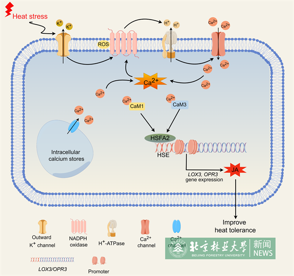 植物遭受热胁迫时,首先被质膜外向K+通道感知,将细胞内的K+转运至细胞外,进而激活质膜NADPH氧化酶RBOHD造成ROS的迸发,再激活质膜H+-ATPase通过消耗ATP将细胞质中的H+排出,引起质膜超极化激活内向钙离子通道,为下游Ca2+流入胞质提供质子驱动力,[Ca2+]cyt的增加则由胞外Ca2+进入胞质和胞内Ca2+的动员和再分配共同完成,反过来,Ca2+也会调节ROS爆发,启动下一轮早期信号事件。钙信号作为第二信使,可与CAM1和CAM3结合并可能通过某种方式影响HSFA2基因的表达。HSFA2作为响应热胁迫的关键转录因子,调控JA合成途径关键酶LOX3、OPR3基因表达,促进JA的合成,降低植物的叶片相对电导率,提高相对含水量和叶绿素含量,从而增强拟南芥的耐热性。
