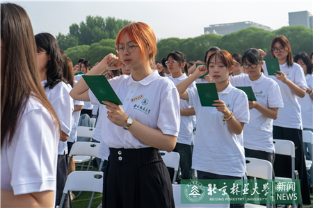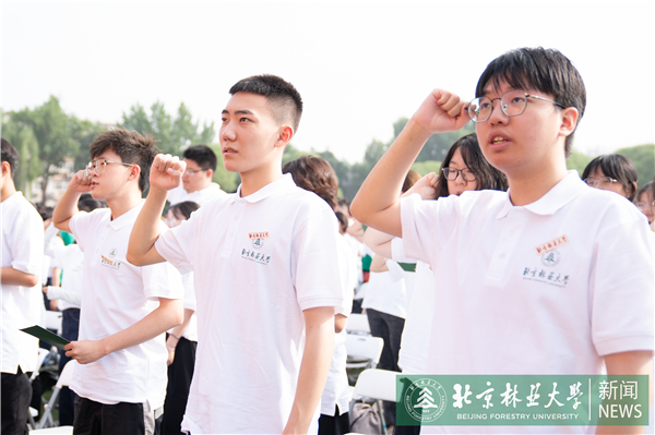 全体新生庄严宣誓。新生代表、工学院车辆23-3班刘胤东同学领誓。