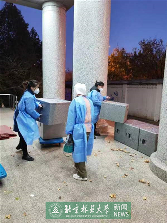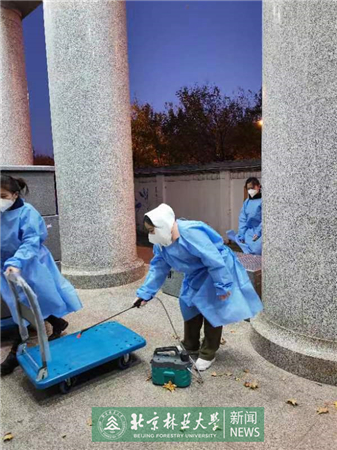 在听到后勤人手不足的消息后,北林附属幼儿园的孙彩风与其他6位老师第一时间主动请求支援一线保障工作。她们负责监督东一门物流缓冲区的消杀工作,从早上7点到晚上7点,轮班值守,一刻也不松懈。郭家珠是其中的一名党员,从疫情开始就坚守在学校,已经许多天没有见过家里的两个孩子了。