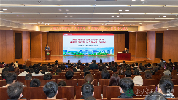王洪元以学习贯彻党的二十大精神为主线,带领同学们系统学习了党的二十大精神要义,全面回顾了过去十年党和国家事业发展取得的历史性成就、发生的历史性变革。结合当前党情国情世情校情,阐释了国际国内的热点问题,聚焦国家生态文明建设,讲解了我校在服务国家建设中取得的跨越式发展。他与同学们共同分享了习近平总书记对青年的期望与寄语,强调同学们要坚定理想信念、听党话跟党走,要珍惜大学时光、练就过硬本领,要厚植家国情怀、践行使命担当。勉励同学们充分把握时代机遇,善于运用国家、社会和学校创造的良好学习条件,传承弘扬“植绿报国”北林精神,立志做有理想、敢担当、能吃苦、肯奋斗的新时代好青年,努力成长为堪当民族复兴大任的时代新人。
