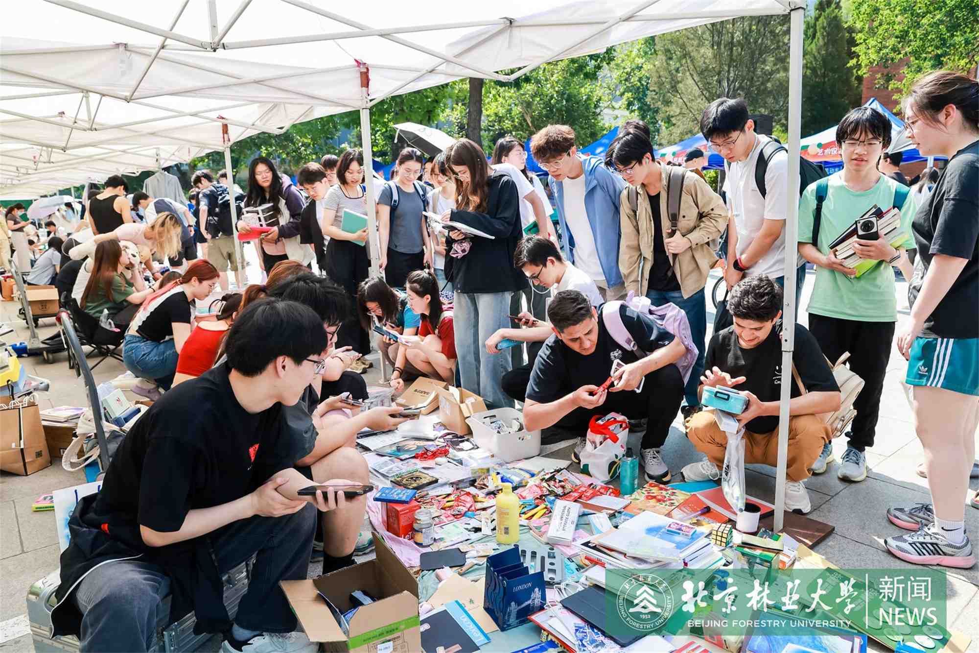 在跳蚤市场区域,毕业生“摆摊”售卖、赠送仍具有使用价值的二手物品。学生公寓功能型党支部学生党员、学生公寓自律委员会志愿服务队为参加活动的师生提供场地指引、防暑药品、饮水等服务。现场还设立“林赠芳菲”毕业捐赠展位,回收符合要求的旧书籍和物品,拟于下半年开学时发放给家庭经济困难新生。