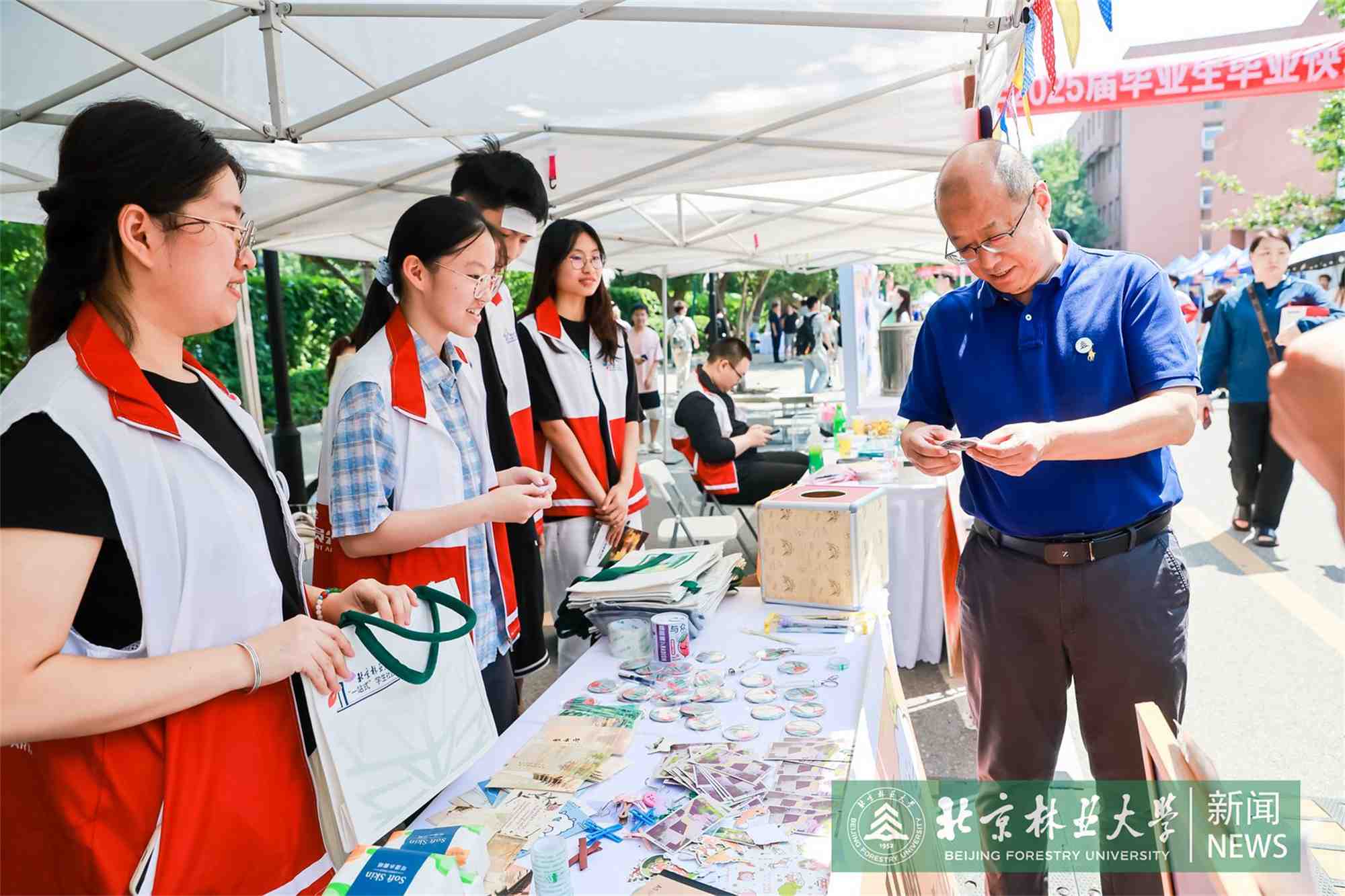 在市集现场,校领导与毕业生亲切交流,询问毕业生们的学习生活情况,倾听他们对学校发展的建议。校领导鼓励毕业生们,在新的起点继续牢记林人初心,永葆林人情怀,在服务生态文明建设的新征程中展现北林学子的风采。在互动环节,校领导在北林融媒的“林印芳华”展位为毕业生加盖祝福语印章并签名留念,同时向参加活动的同学们送上精美文创礼物及我校综合保障部餐饮中心的特色产品。